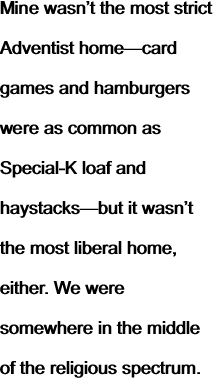 I grew up an Adventist, third generation to be exact. Mine wasn’t the most strict Adventist home—card games and hamburgers were as common as Special-K loaf and haystacks—but it wasn’t the most liberal home, either. We were somewhere in the middle of the religious spectrum. This moderate form of Adventism greatly influenced my life and shaped my religious and world views.